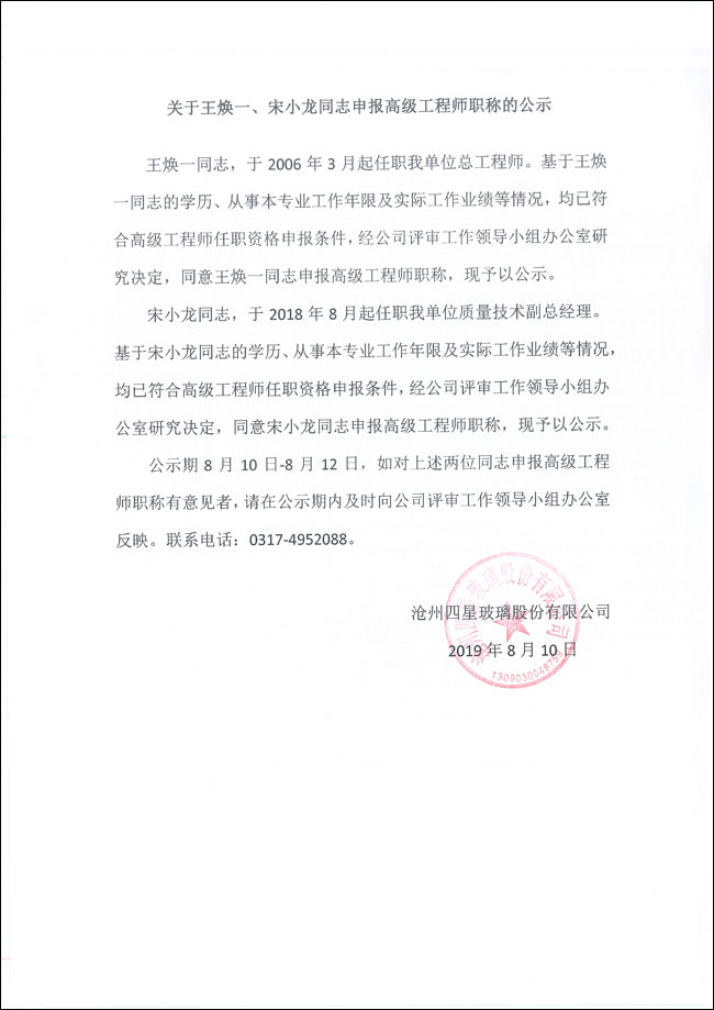 關(guān)于王煥一、宋小龍同志申報(bào)高級(jí)工程師職稱的公示